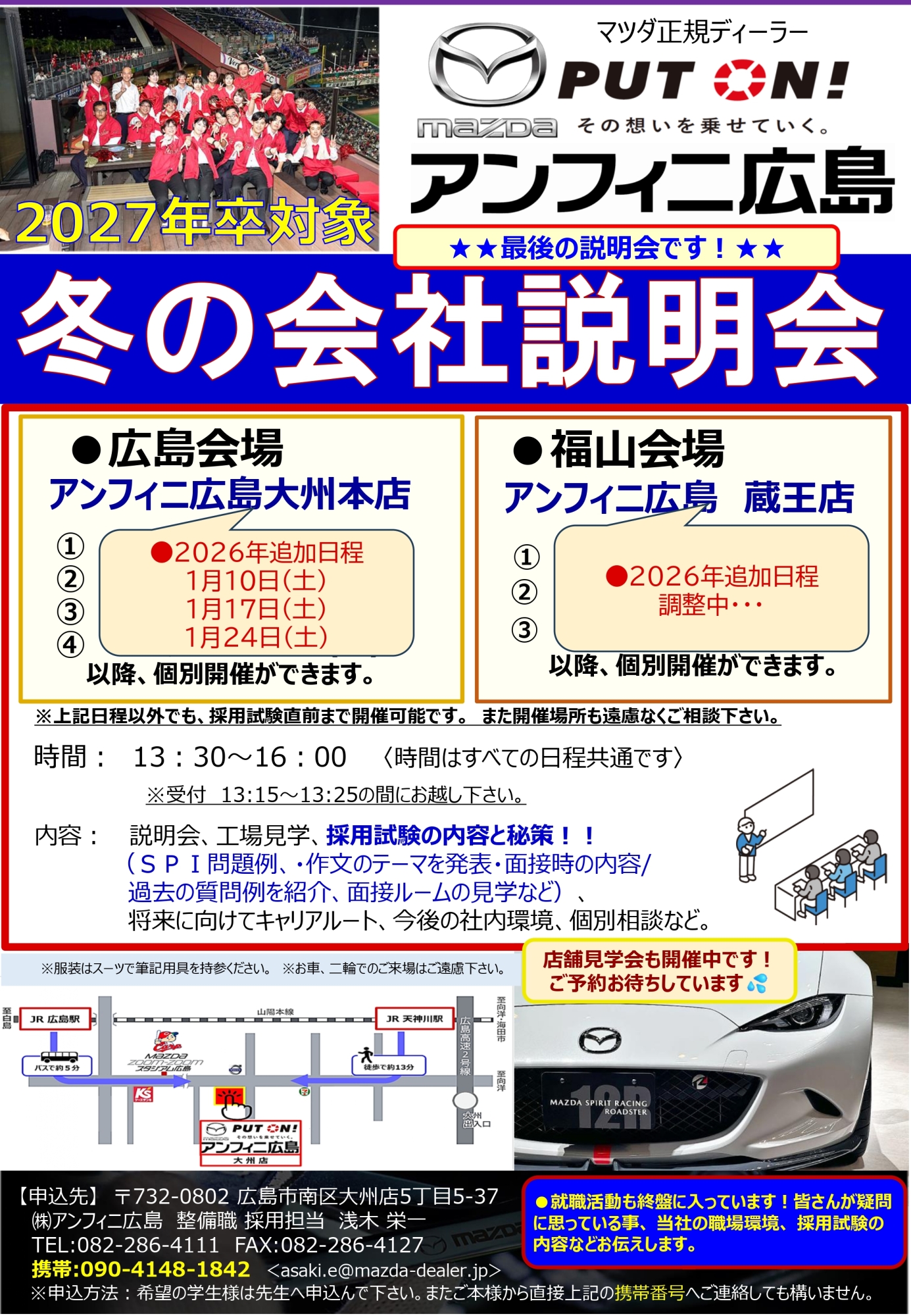 2027年卒業の整備職希望の方を対象に「冬の会社説明会」を11月29日(土)から12月27日(土)まで毎週末開催予定! 12月は応募先を最終決断する大事な時期です。それに向けて最後の説明会で会社概要と募集要項のおさらい、さらには個別相談会、夏・秋にはお伝えしてない新情報、採用試験に向けて事前課題の発表や㊙試験対策㊙などなど・・・。 是非とも参加お待ちしています!