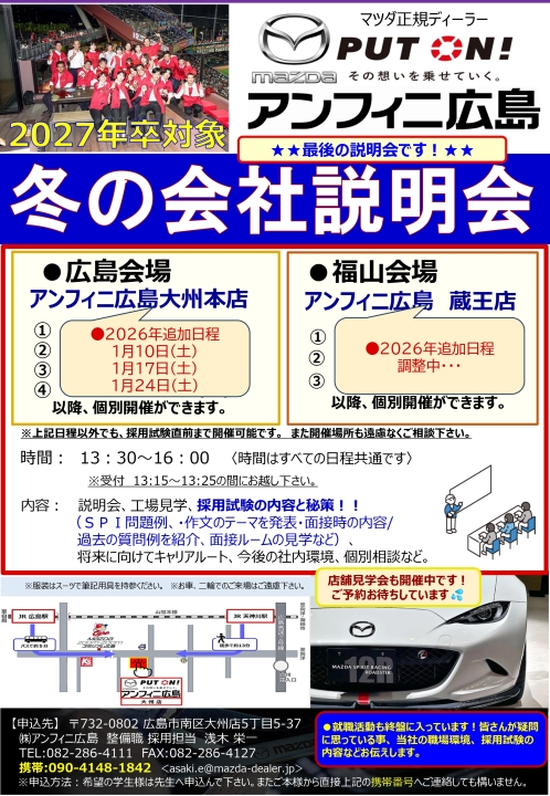今、アンフィニ広島全17店舗を対象に「個別店舗見学会」を実施中です!! 放課後のあとに... 土日祝のお休みの時に... 一緒に行きませんか? 皆さんの家の近くにある店舗、行ってみたい店舗など何回でも見学が出来ます。各店舗のスタッフに直接聞きたい事を聞いてよりエンジニアとしてのイメージが出来ると思います。参加応募は学校経由もしくは採用担当の浅木迄ご連絡下さい。